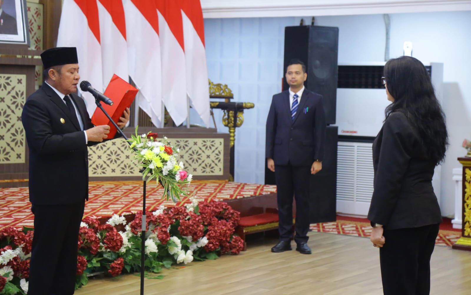 Gubernur Sumsel Herman Deru saat mengukuhkan Heni Sri Wahyuni, S.Kom., M.T.I. sebagai Kepala Kantor Regional VII Badan Kepegawaian Negara (BKN) Palembang, Selasa (22/7/2025).