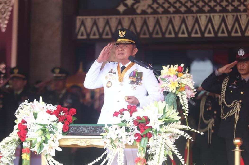 Gubernur Sumsel Herman Deru, bertindak sebagai Inspektur Upacara peringatan detik-detik Proklamasi HUT ke-80 RI berlangsung khidmat di halaman Griya Agung Palembang, Minggu (17/8/2025).