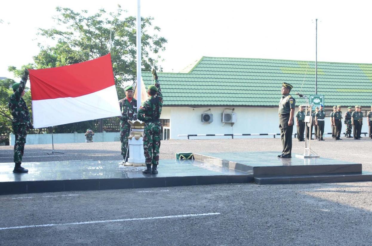 Tampak momen pengibaran bendera merah putih pada Upacara Peringatan Hari Sumpah Pemuda ke-96 Tahun 2024, bertempat di lapangan Makorem 044/Gapo, Senin 28 Oktober 2024.