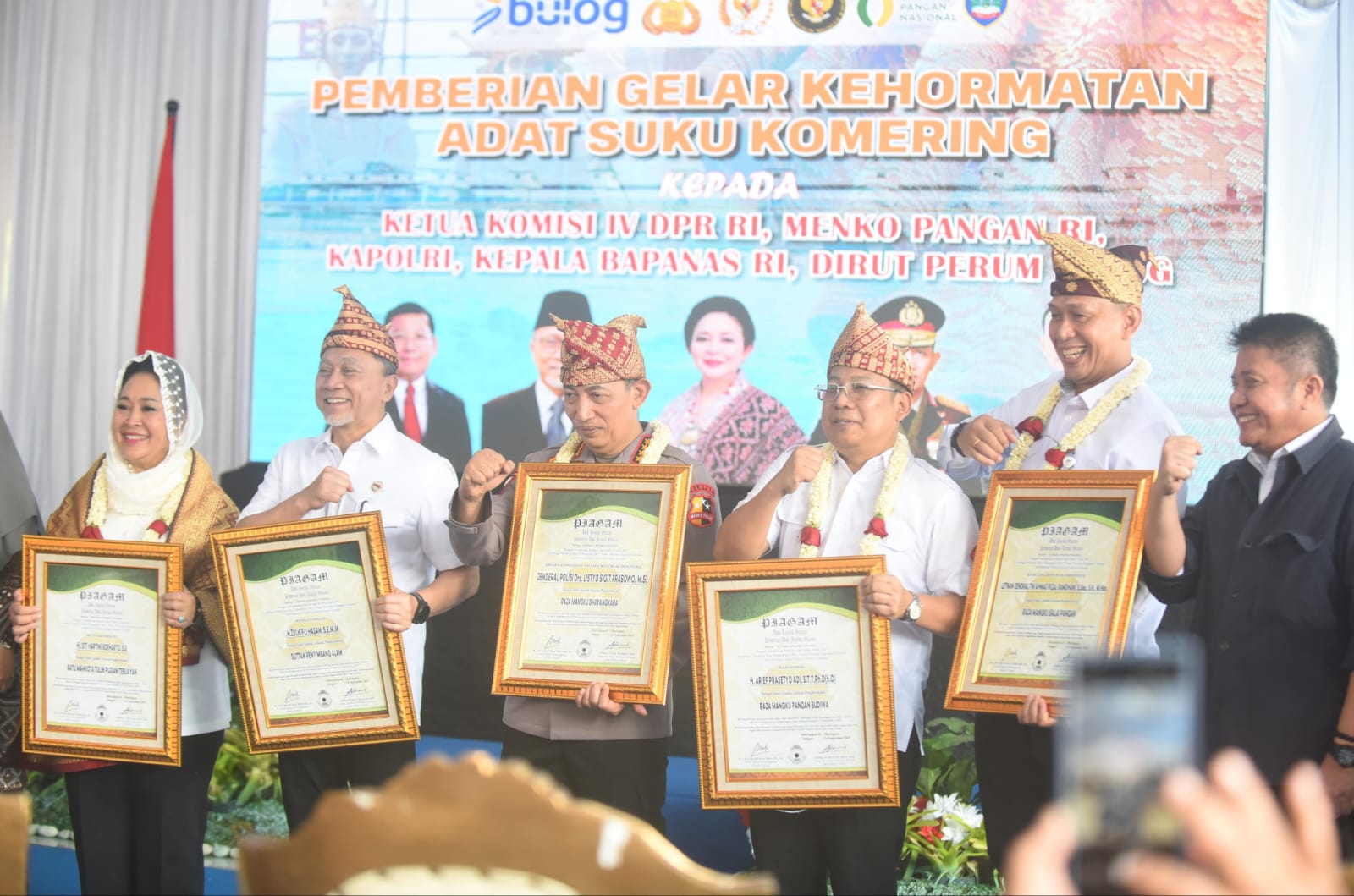 Adapun lima tokoh yang mendapat gelar adat yakni, Menko Pangan RI Dr. (h.c) H. Zulkifli Hasan sebagai Suttan Penyimbang Alam, Kapolri Jenderal Polisi Drs. Listiyo Sigit Prabowo sebagai Raja Mangku Bhayangkara, serta Ketua Komisi IV DPR RI Siti Hediati Soeharto yang diberi gelar Ratu Mahkota Tulin Pujian Tebuayan.