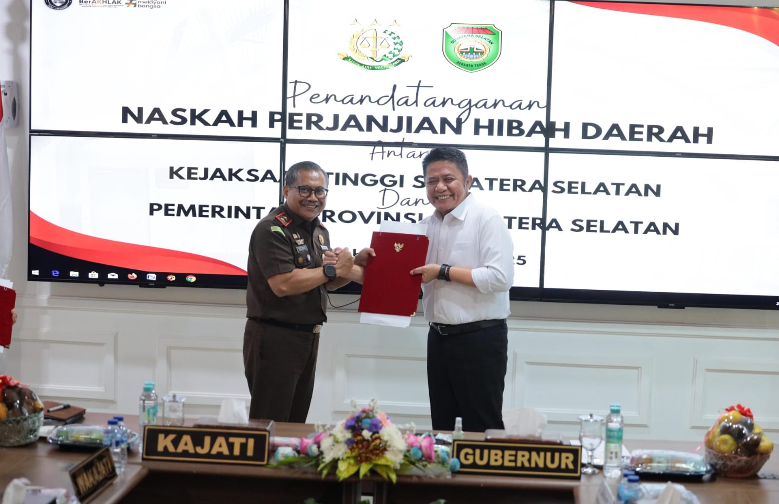 Palembang,SuaraMetropolitan – Gubernur Sumatera Selatan (Sumsel) H. Herman Deru secara resmi menandatangani Naskah Perjanjian Hibah dan Berita Acara Serah Terima lahan milik Pemerintah Provinsi (Pemprov) Sumsel kepada Kejaksaan Tinggi (Kejati) Sumsel, Senin (26/5/2025) pagi.