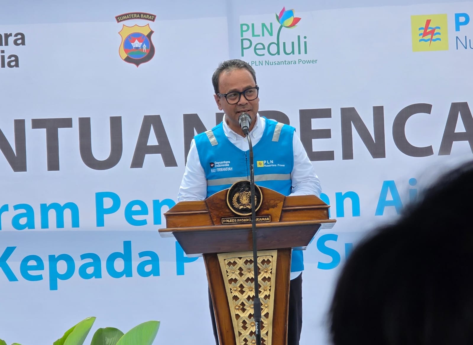 Direktur Utama Ruly Firmansyah saat memberikan sambutan bantuan air bersih pascabencana di Kabupaten Padang Pariaman, Sumatera Barat. PLN Nusantara Power tidak hanya berperan menjaga keandalan pasokan energi nasional, tetapi juga hadir untuk mendukung pemulihan sosial masyarakat