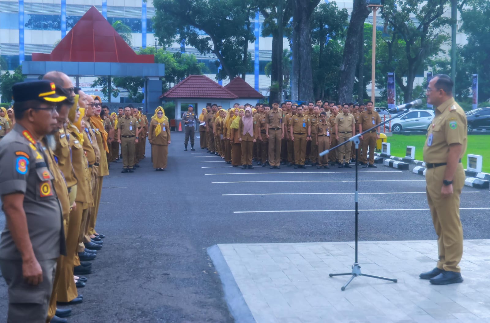 Sekda Sumsel, Edward Candra saat memimpin Apel Penutup Tahun 2025 di lingkungan Pemerintah Provinsi Sumsel, Senin (29/12/2025) pagi.