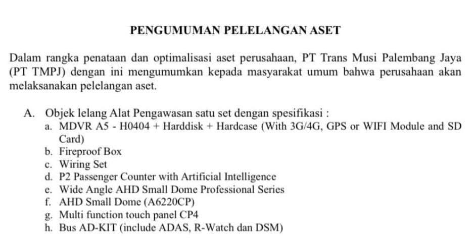 Palembang,SuaraMetropolitan PT Trans Musi Palembang Jaya (TMPJ) mengumumkan pelelangan sejumlah aset perusahaan pada tahun 2026. Aset yang dilelang merupakan perangkat operasional yang sudah tidak lagi digunakan, namun masih dalam kondisi layak pakai. Pelelangan ini dilakukan sebagai bagian dari penataan dan optimalisasi aset perusahaan.