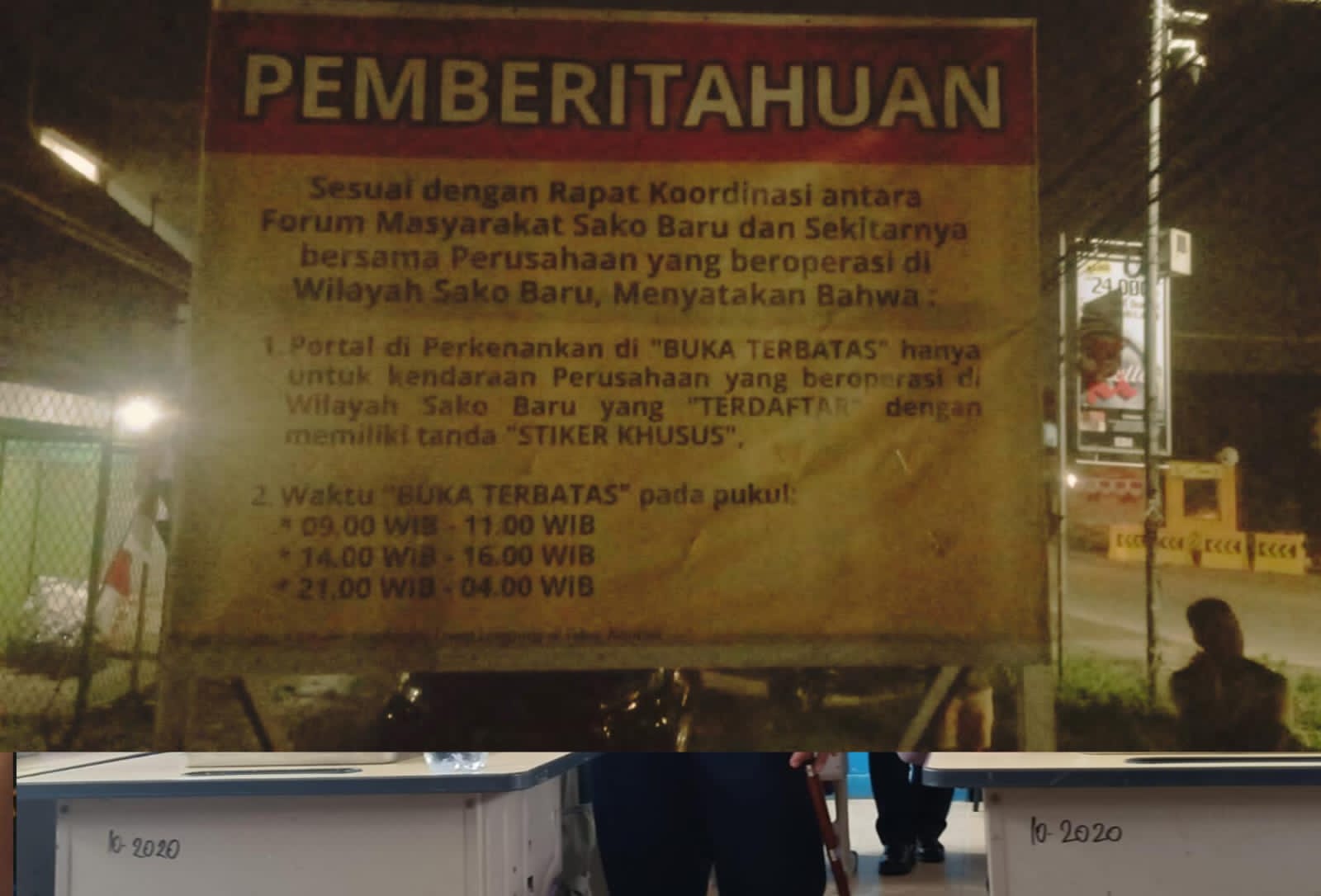 Fakta di lapangan juga memperlihatkan hal berbeda. Sebuah papan pengumuman berukuran besar telah dipasang di Jalan Sako Baru. Dalam pengumuman tersebut, tertulis jelas bahwa portal jalan “buka terbatas” hanya untuk kendaraan perusahaan yang memiliki tanda stiker khusus, dengan jadwal operasional tiga sesi, yakni pukul 09.00–11.00 WIB, 14.00–16.00 WIB, dan 21.00–04.00 WIB.
