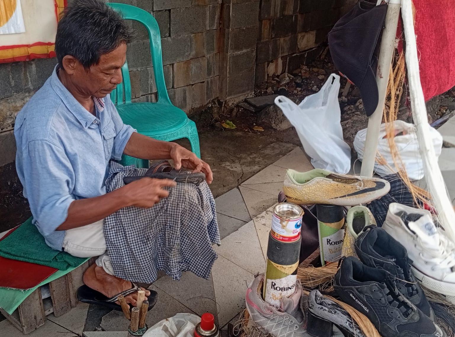 Herman tetap setia menunggu pelanggan yang datang memperbaiki sepatu. Ia mematok harga jasa perbaikan berdasarkan tingkat kerusakan sepatu.