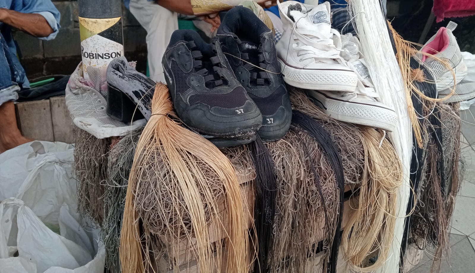 Beberapa sapatu yang belum diperbaiki, serta benang -benang untuk menjahit sol sepatu (foto SM/Andika)