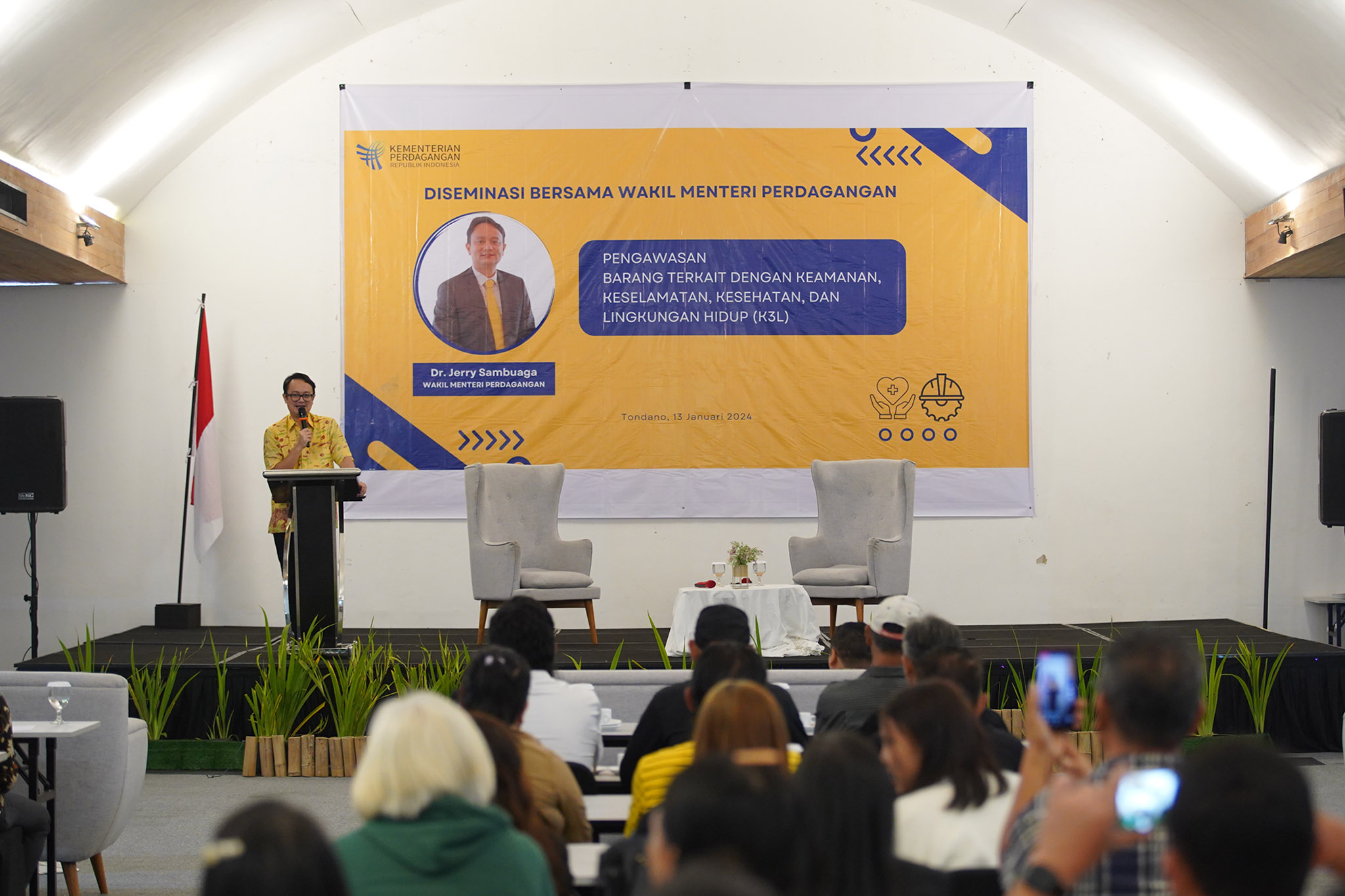 Wakil Menteri Perdagangan, Jerry Sambuaga memberikan sambutan pada kegiatan Diseminasi Pengawasan Barang Terkait Keamanan, Keselamatan, Kesehatan, dan Lingkungan Hidup (K3L) yang dilaksanakan di Kabupaten Minahasa, Sulawesi Utara, Sabtu (12 Jan).